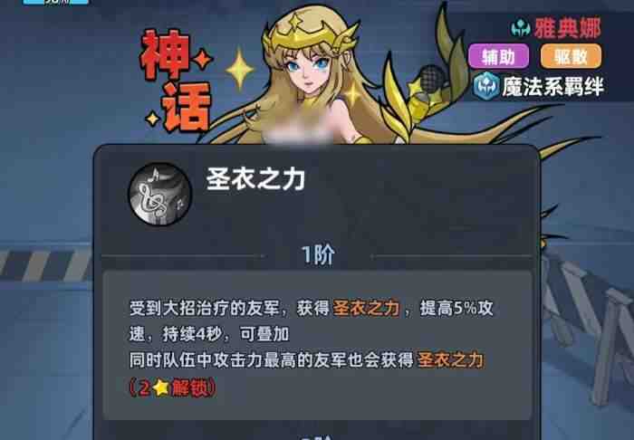 同时,雅典娜的大招同(tong)样(yang)能治疗队友,当场上存在有着神圣道标效果的友军时,大招的治疗同(tong)样(yang)也对他生效,而且大招的治疗倍率非常夸张,可直接让残血队友的血线立刻回复到安全线以上。若玩家的雅典娜已经升到了一星,那么队友在接(jie)受(shou)了雅典娜的战技治疗后,身上还会获得雅典娜之盾的效果,可为自己带来减伤增益,并且还会直接眩晕攻击自己的敌人。当雅典娜有二星时,雅典娜在使用大招治疗队友时,可为队友提供增加(zengjia)攻速的圣衣之力,且队伍中攻击最高的队友(通常为主输出),也能获得圣衣之力的加持。