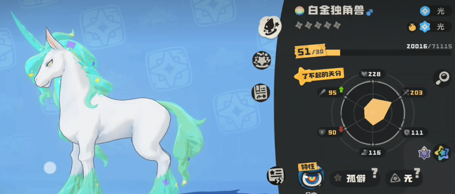 洛克王国:世界异色炫彩独角兽获取攻略要获得异色炫彩独角兽,前提条件是得先有一只白金独角兽。这只宠物需要通(tong)过(guo)驯化的方式,加入到队伍里面,驯化成功之后,就可以(jiukeyi)把它当作战斗宠物来使用了。但光有白金独角兽还不够,还得让它满足进化的条件才行。这里面涉及到两个比较重要的东西,一个叫进化之力,另一个叫首(shou)领血脉。这两样东西必须同时拥有,缺一个都没办法完成(wancheng)进化过程。