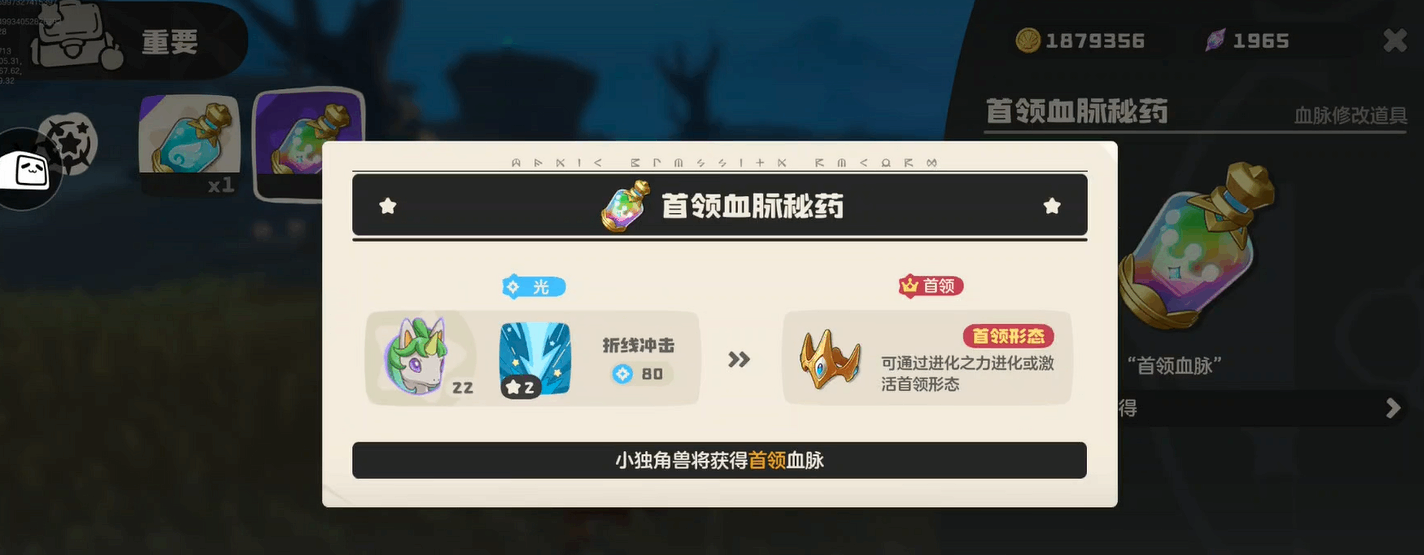 当白金独角兽同时拥有了进化之力和首(shou)领血脉之后,就可以(jiukeyi)进行进化操作了。不過这里有个細節要注意(zhuyi),在准备让它上场战斗之前,要先检查一下精灵(ling)背包里面的强化术设置。原本可能装备了其他的强化术,这时候需要把它替换成进化之力。只有把强化术换成进化之力,在战斗中才能将进化的机制触发,再配合上首(shou)领血脉的效果,白金独角兽就可以(jiukeyi)完成(wancheng)向彩虹独角兽的转变了。