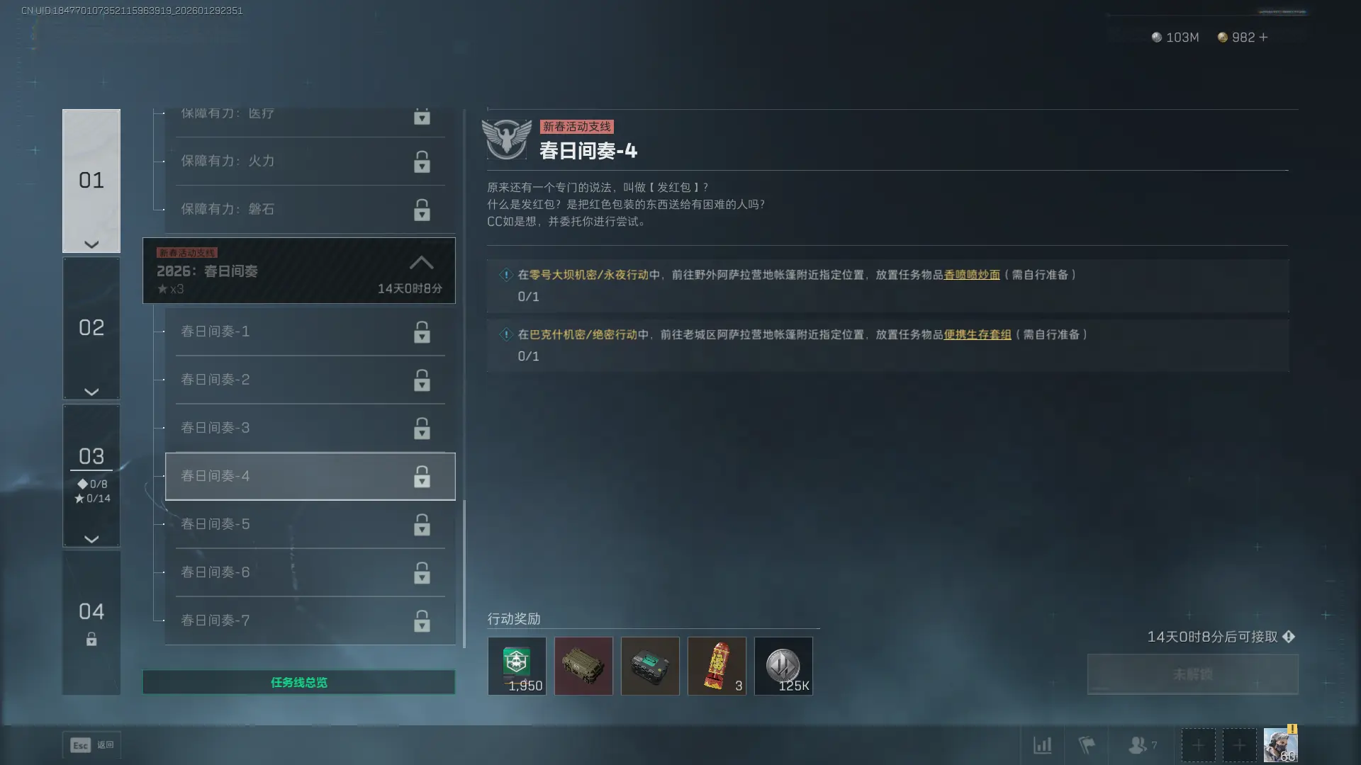 4、任务奖励:经验x1950、賽季任务仿制钥匙补给包x1、3x3保险箱1天权限卡x1、好运爆红烟花x3、哈夫币x125000