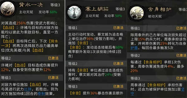 周泰的天(tian)赋(fu)【舍身相护】可为队友承担伤害,显著增强整体生存能力,为许褚创造稳定的输出环境。