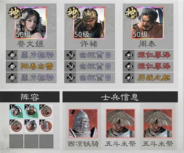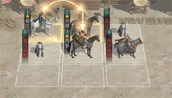 兵种站位:在许褚的前方和蔡文姬的下方各放置一个五斗米祭,在周泰的前方放置一个西凉铁骑。