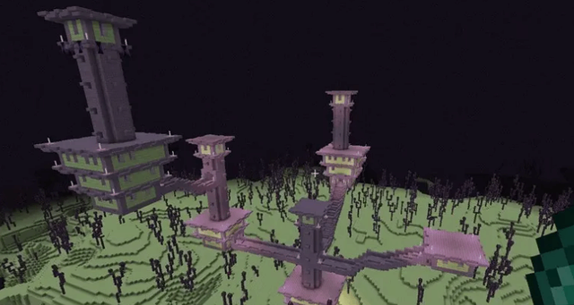 可能会生成(generate)成一个单独的塔,或一个庞大而复杂的跨越连接的塔,在某些房(fang)间里,(通常在高耸结构的顶部)有箱子和一些末影箱,装饰性的紫珀楼梯从塔的两侧突出,塔的外沿会有一些旗帜,楼梯会彼此连接多个塔。