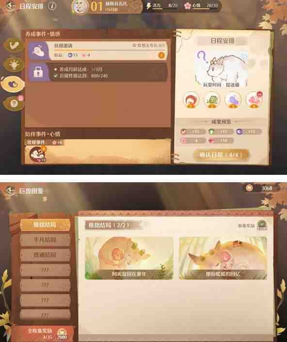 不需要点任何(he)互动、设备用起来和喂食,直接每日日程安排无限选常规事件(课程安排示例如下图),不需要安排任何(he)养成事件,控制总属性全C并相加<600,直至16月龄养成结束。(当然可以买点装饰品给小巨兽,到(dao)底(di)不是无情任务速刷机器人)