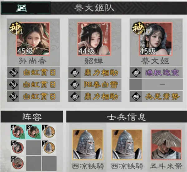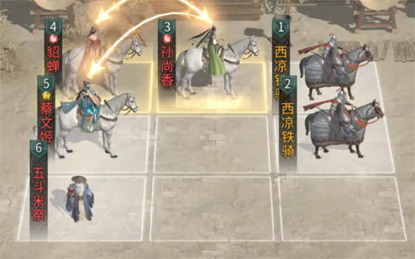 兵种站位:在蔡文姬的下方放置一个五斗米祭,在孙尚香前方放置两名西凉铁骑。