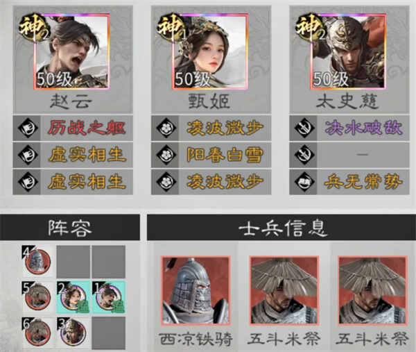 兵种站位:阵容第一行末尾放置一名西凉铁骑;在甄姬与太史慈的后方,分别放置一名五斗米祭。