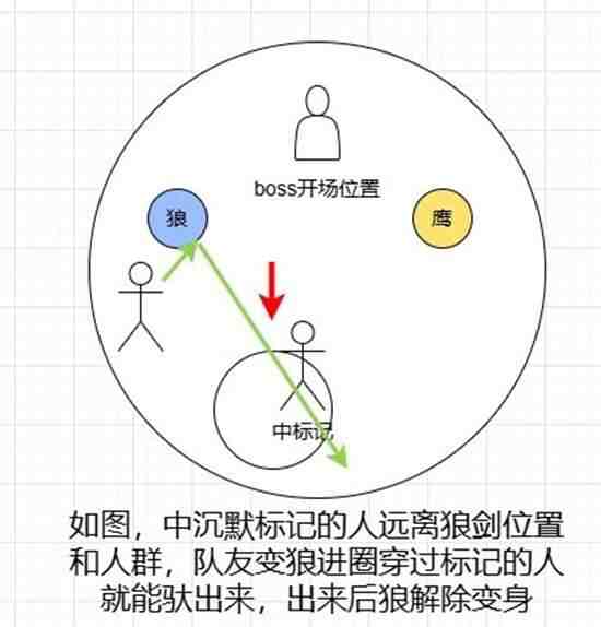 2、 boss点一个人(yigeren)蓝圈沉默,被点的远离人群和狼剑位置,1个队友变狼穿过蓝圈中的(middle)队友即可驮出来,然后解除变身
