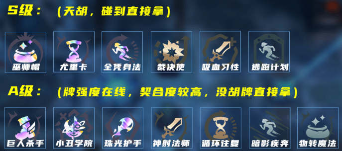 S级(天胡,碰到直(zhi)接(jie)晕): 巫师帽、尤里卡、全凭身法、裁决使、吸血习性、逃跑(taopao)计划。