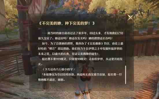 里边提到《完美偶像》是一档节目,由“嘿芯”甜品赞助!我们致力于在伊赞之土中发掘怀揣梦想的未来之星,以盛大的庆典,见证完美偶像的诞生!