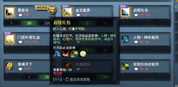 红线和双倍經驗符建议(yi)直接买商城60元宝的启程礼包,这比用师徒声望换红线划算得多。