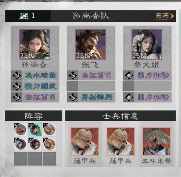 兵种站位:在蔡文姬的上方放置亿款五斗米祭,在孙尚香和张飞的前方各放置亿款藤甲兵。