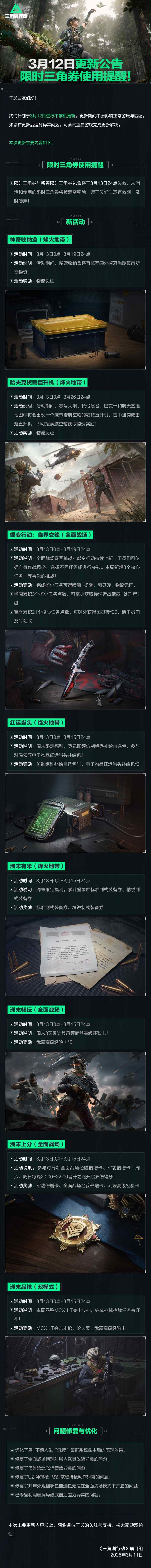 三角洲行动3月12日更新内容一览20263月12日更新公告丨限(xian)时三角券shiyong提(ti)醒(xing)!