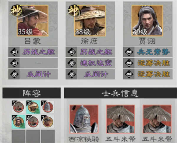 兵種站位:徐庶和吕蒙的后面各放置一名五斗米祭,徐庶的前面放置一名西凉铁骑。