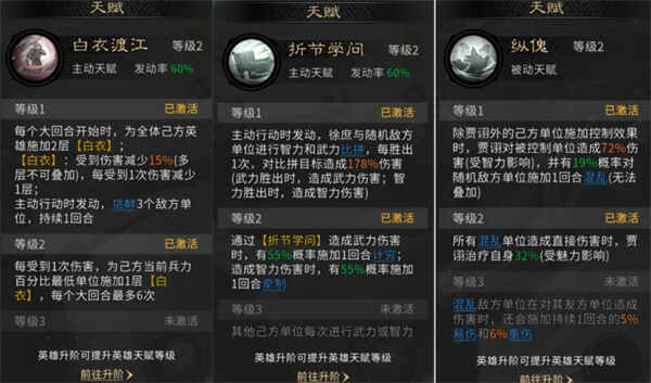 贾诩的天赋【纵傀】,是其作为“控制连锁放大器”的核心。每当除贾诩外的己方单位施加控制效果时,贾诩会立即对被控朩摽造成智力伤害,并有概率对随机敌方单位施加混乱(confusion)状态。所有处于混乱(confusion)状态的单位造成矗帹伤害时,贾诩都会根据自身魅力恢复大量兵力,这不仅将单点控制扩散为群体混乱(confusion),更使他在混乱(confusion)的战场上获得了强大的自我续航能力,形成越战越勇的压制循环。