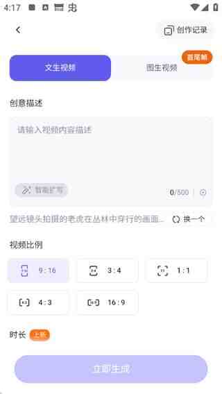3、选择(hoose)你喜(xi)欢的模版,提供(tigong)两种创作模式【文生视频、图生视频】描述内容(neirong)點击立(li)即(ji)生(sheng)成(cheng)即(ji)可(ke)