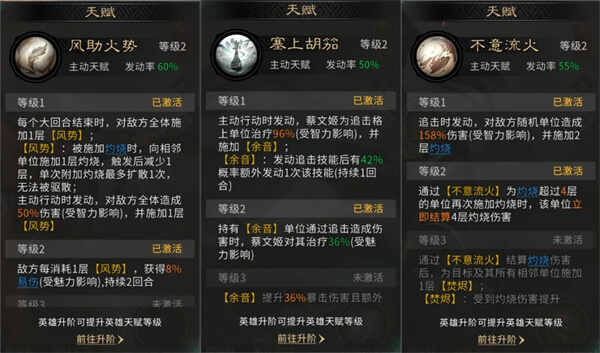 蔡文姬的天赋技能【塞上胡笳】,阔以为陆逊提供治疗,并赋予【余音】效果,使陆逊发动追击技能后有42%概率(gailv)额外发动1次该技能。