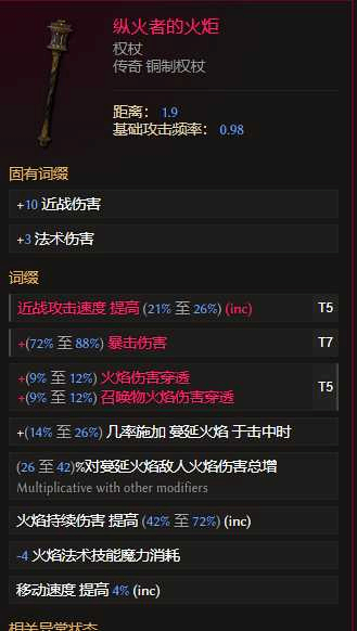火炬自带最多42%more,并且点伤的差距不再是劣势。火系伤害还有个精装神像巅峰提升40%more输出,因此火系火圆舞投掷非常的适配。