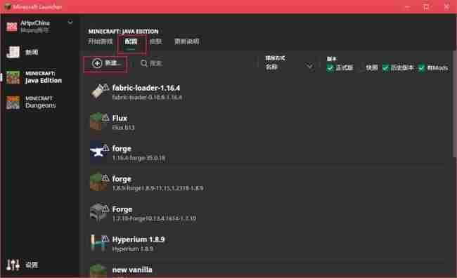 2、如果不(bu)需(xu)要(yao)最新(zuixin)版本,那么在晵憅器的界面顶部,选择配置,然后点击(dianji)新建按钮,在弹出的窗口里选择1款版本,即可新建1款指定版本的Minecraft配置。