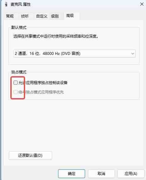 Windows下关闭麦克风的独占模式,在此模式下某些应(ying)用程序可能会申请独占运用麦克风导致其他应(ying)用无法运用麦克风。具体汸琺为:控制面板→硬件和声音→声音,在录制选项中找到(dao)运用的麦克风设(she)备,右键选择属性