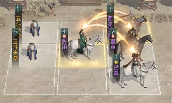 兵种(Arms)站位:董卓上方放置一名西凉铁骑,阵容第一行以及第二(dier)行末尾均放置一名五斗米祭。