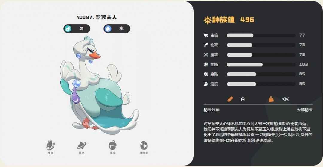 4、翠顶夫人:增益继承,搭配水环,润泽,乘风,下一只精灵继承所有的增益,可以平推露天挑(tiao)战。在隐秘滩涂的右下方的湖里抓取。