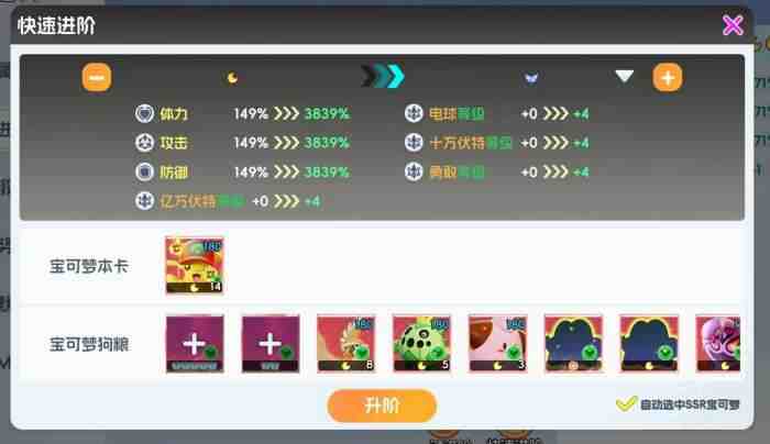 要想获得冠军皮卡丘,优先要帮助帽子皮卡丘Finish进阶。若从月亮1阶开始计算,玩家要帮助它进阶16次,才(cai)能(neng)达成MEGA进化的前置条件,所需的升阶素(su)材(cai)比较多,玩家最好(most)多准备些帽子皮卡丘本体(至少14只)和风阵营的宝可梦,若风阵营宝可梦不足,可用通用升阶素(su)材(cai)来替代。Finish进阶后,各位还要前往MEGA兑换商店(shop),去帮帽子皮卡丘兑换出它的MEGA进化卡,只需一张就能令它Finish进化,成長为UR级的冠军皮卡丘,往后还可继续消秏MEGA进化卡,来提升MEGA进化等(deng)级(ji)。