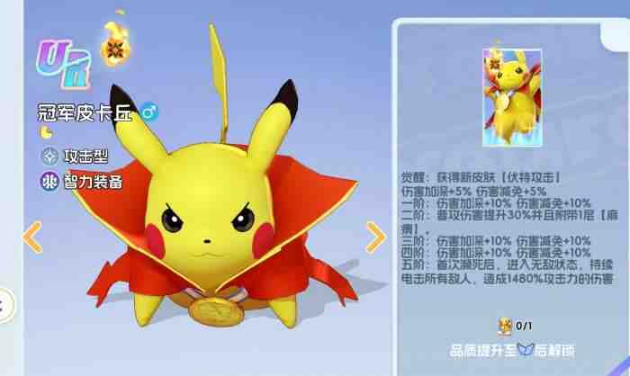 宠物集结冠军皮卡丘分享无法直接获取,需通过让帽子皮卡丘进化才能收集,并且它还是宠物集结中品级最高的宝可梦之一,整体的强度相当出色。宠物集结冠军皮卡丘养成指南不光会介绍此宝可梦的获取方法,还会向玩家们分享些冠军皮卡丘的养成建议,下面是相关内容介绍。