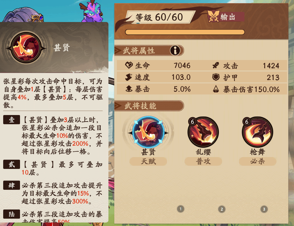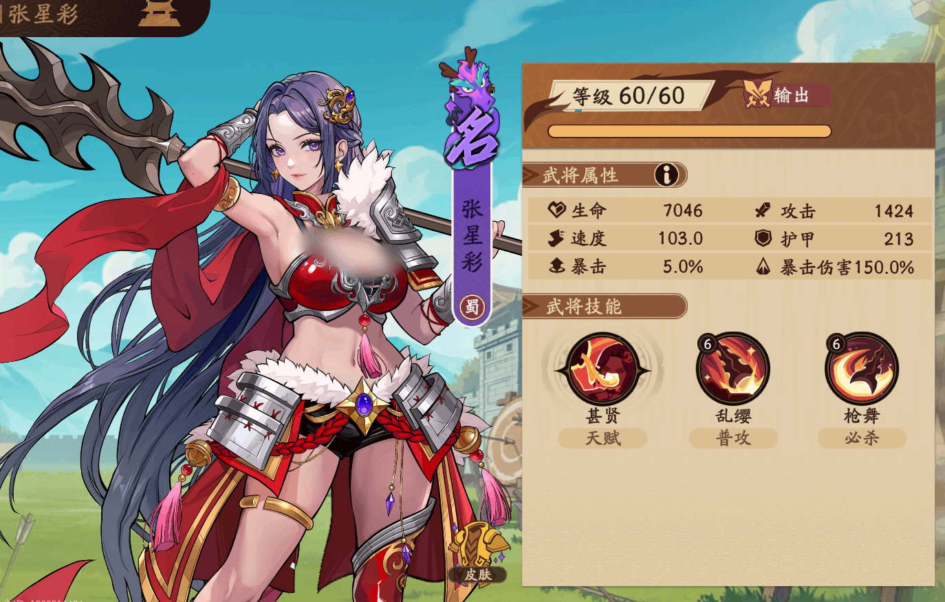 《三国杀:武将觉醒》张星彩介绍张星彩是名将浠洧度的输出定位角色,隶属于蜀国,初始就有150%的暴击伤害加成,在局内的定位里面属于是前排战士类型的输出,主打的是近战。虽然有一定的输出力,但是她的打击方向均为前排单体,如果遇上前排坦克加法师的阵容就比(bi)较难过墙。