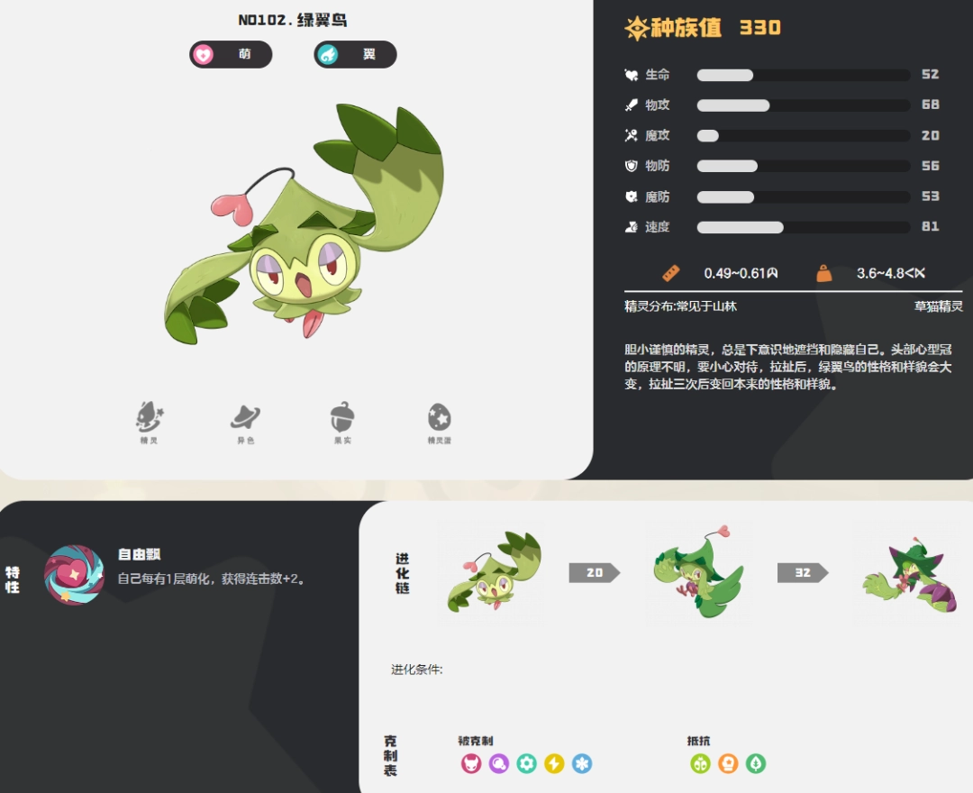 胆小谨慎的精(jing)灵(ling),总(zong)是下意识地遮挡和隐(yin)藏自己(ziji)。头部心型冠的原理不明,要小(xiao)心对待,拉扯后,绿翼鸟的性格和样貌会大变,拉扯三次后变回本来的(laide)性格和样貌。