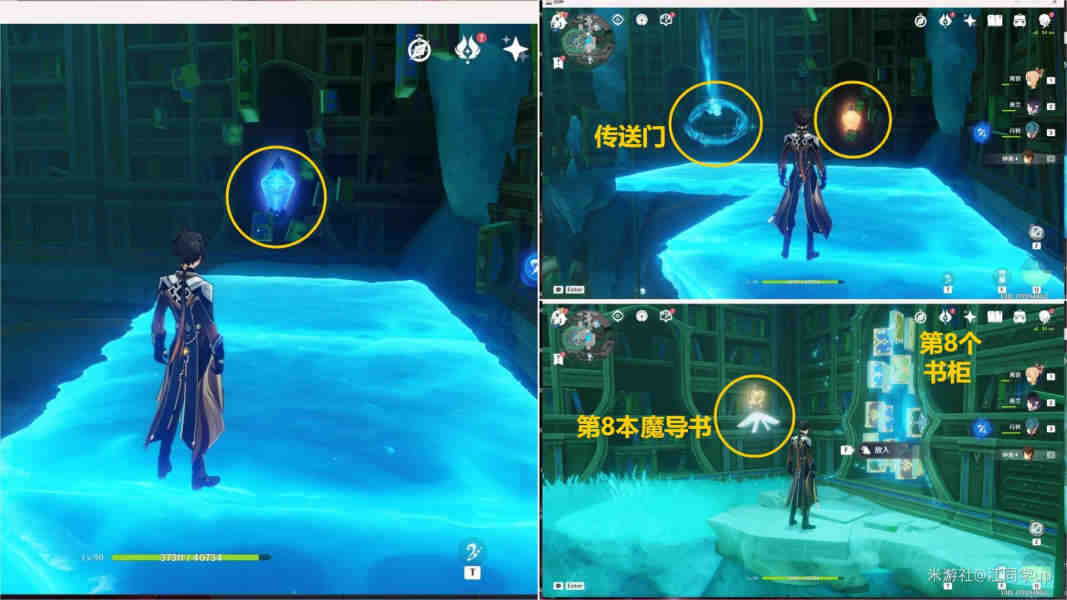 1、第1本【魔导书】和第1个【书柜】位置,靠近空中飞舞的【魔导书】,先按T键,然后再按E键后,就会(hui)将【魔导书】暂停住,然后就可以拾取【魔导书】了,另外【魔导书】是在周围(zhouwei)不断飞舞和消失的,当其出现后定住拾取即可;