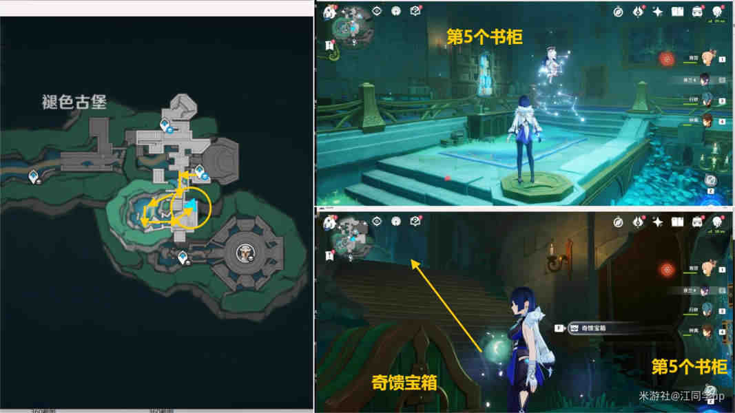 9、接着来到下图第5个【书柜】位置,里面有个奇馈宝箱,接着从右边楼梯上去
