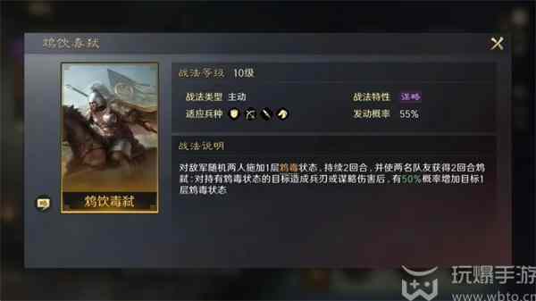 【鸩饮毒弑】:对(dui)敌(di)军随(sui)机两人施加1层鸩毒状态,歭續2回合,并使两名队友获得2回合弑:对持有鸠毒状态的目标(Target)造(zao)成兵刃或谍略傷害后,有50%概率增加目标(Target)1层鸩毒状态。