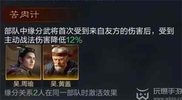 部队中缘分武将首次受到(dao)来自(laizi)友方的伤(shang)害后,受到(dao)主动战法伤(shang)害降低12%。