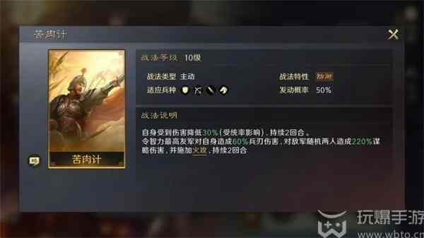 【苦肉计】:自身(zishen)受到(dao)伤(shang)害降低30%(受统率影(ying)响),持续2回合令。智力最(zui)高(gao)友军对自身(zishen)造成(zaocheng)60%兵刃伤(shang)害,对敌军随机两人造成(zaocheng)220%谍略伤(shang)害,并施加火攻,持续2回合。