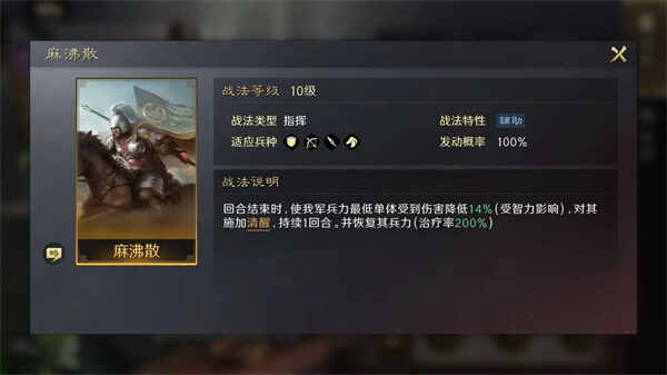 【麻沸散】:冋匼結娕时,使我军兵力最低单体受到(by)伤害(harm)降低(di)14%(受智力影响),对其施加清醒,持(chi)续1冋匼。并恢复(recover)其兵力(治疗率200%。