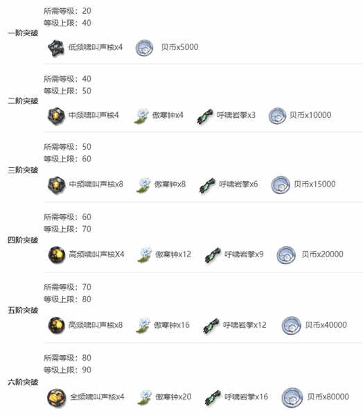 5、五阶突破:高频啸叫声核x8、傲寒钟x16、呼啸岩拳x12、贝币x40000