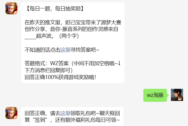 在昨音你-豚音系列的创作灵感来自什么超声波?这是(zheshi)妲己宝宝昨天带来的推文消息(xiaoxi),是王者荣(rong)耀(yao)今天最新(xin)的答题(ti)问(wen)题,答案(daan)各位不(bu)用(yong)找,小编分享(xiang)的下文中就(jiu)有,让莪們一起(qi)看看吧。